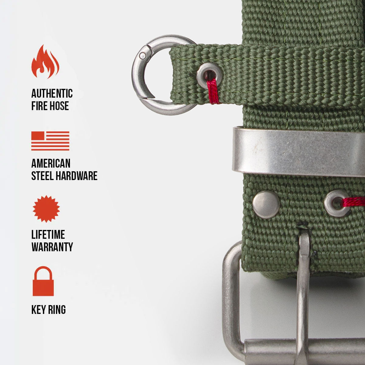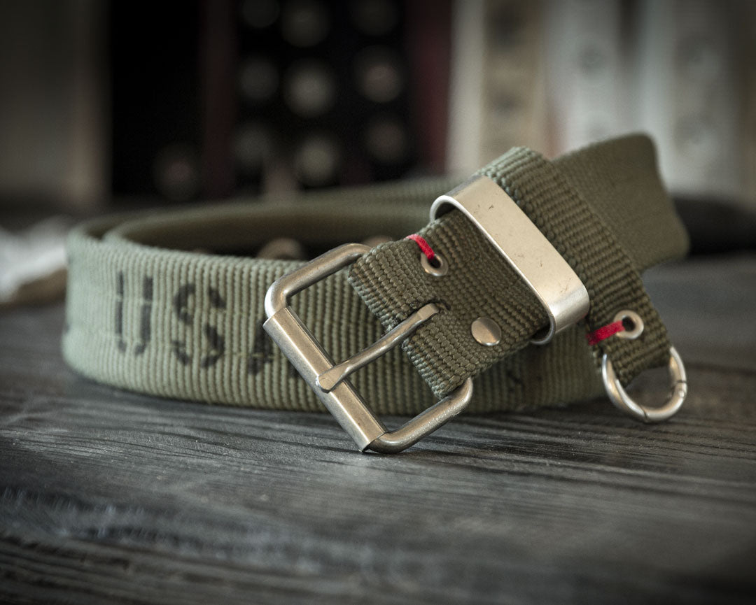 The "In The USA" MARINE GREEN belt carries the dignity and courage that is displayed everyday by the men and women firefighters of the United States. The MARINE GREEN EDITION symbolizes the end of the hoses journey and all the battles that have been fought. Featuring American Steel hardware finish and a removable key ring.