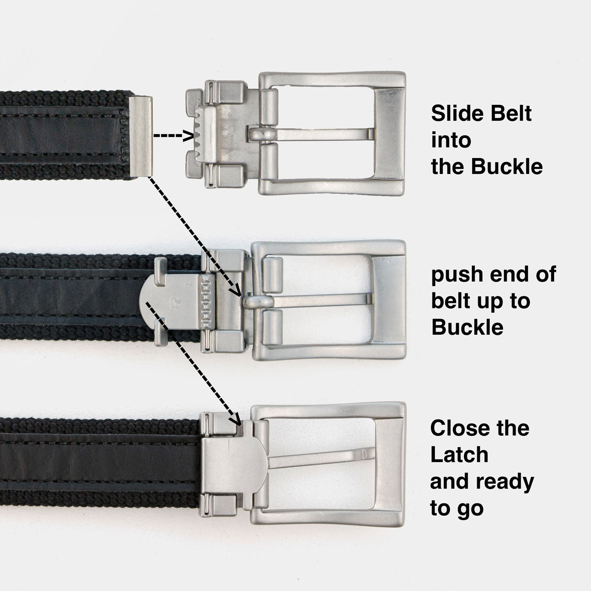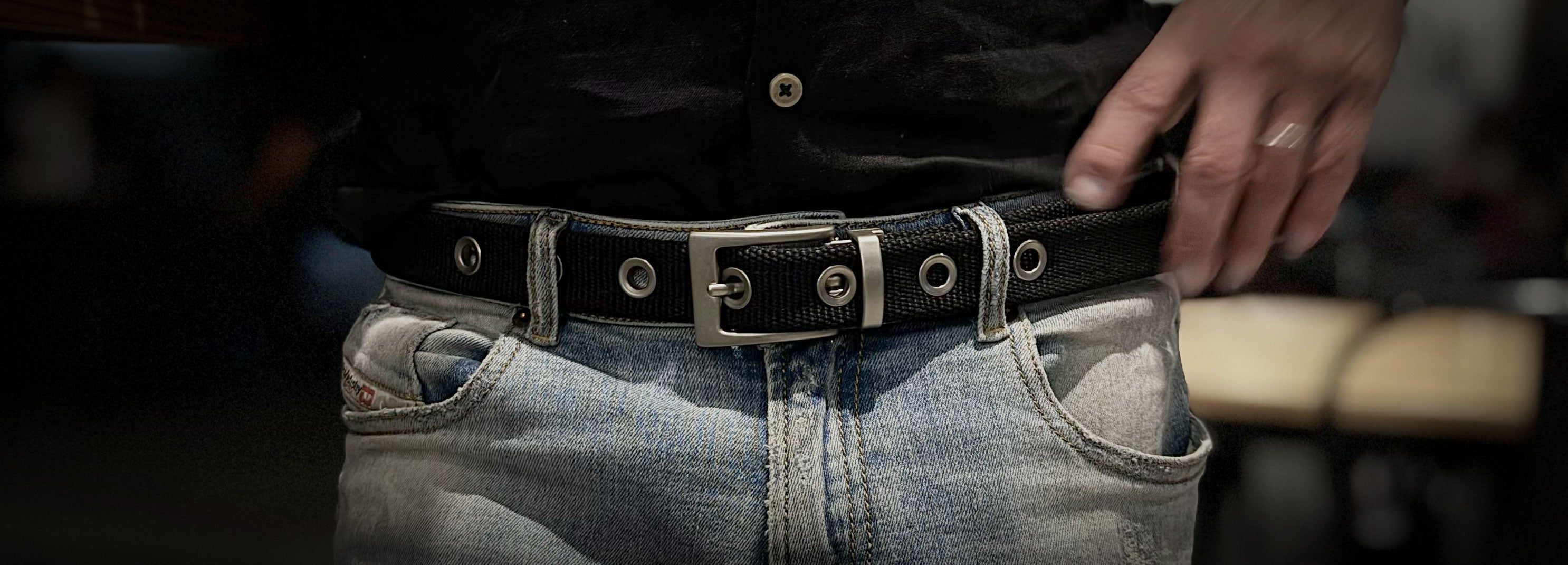 The Slim edition belt is 1 1/8" wide and features an interchangeable buckle. Ideal for dress pants or slimmer denim, offering a refined take on our iconic firehose belt.