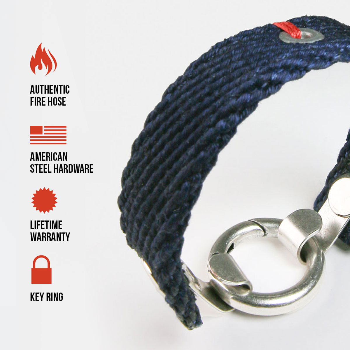 The USA Cuff carries the dignity and courage that is displayed everyday by the men and women firefighters of the United States. The adjustable snaps allow easy sizing and features our signature key ring loop for closure.